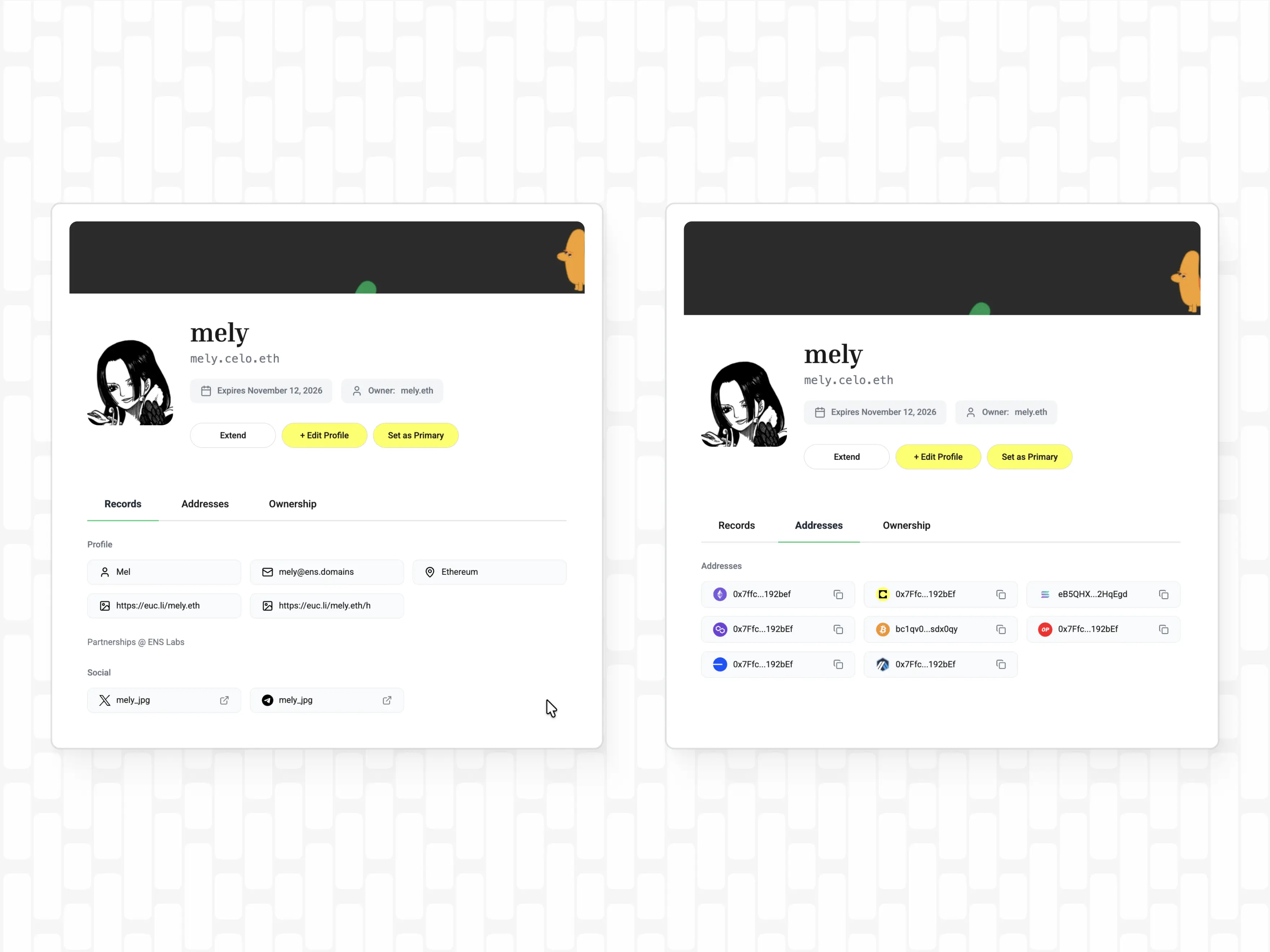 With a Celoname, users can receive tokens on multiple networks by adding a preferred wallet address on Celo and additional multichain addresses. Adding further name records such as an avatar, social media links, or a profile bio turns a simple wallet address into a fully-fledged onchain profile. Celonames follow the same concept that builds the foundation of ENS: Map a wallet address to a human-readable name and combine it with profile records to create a fully functional onchain identity.