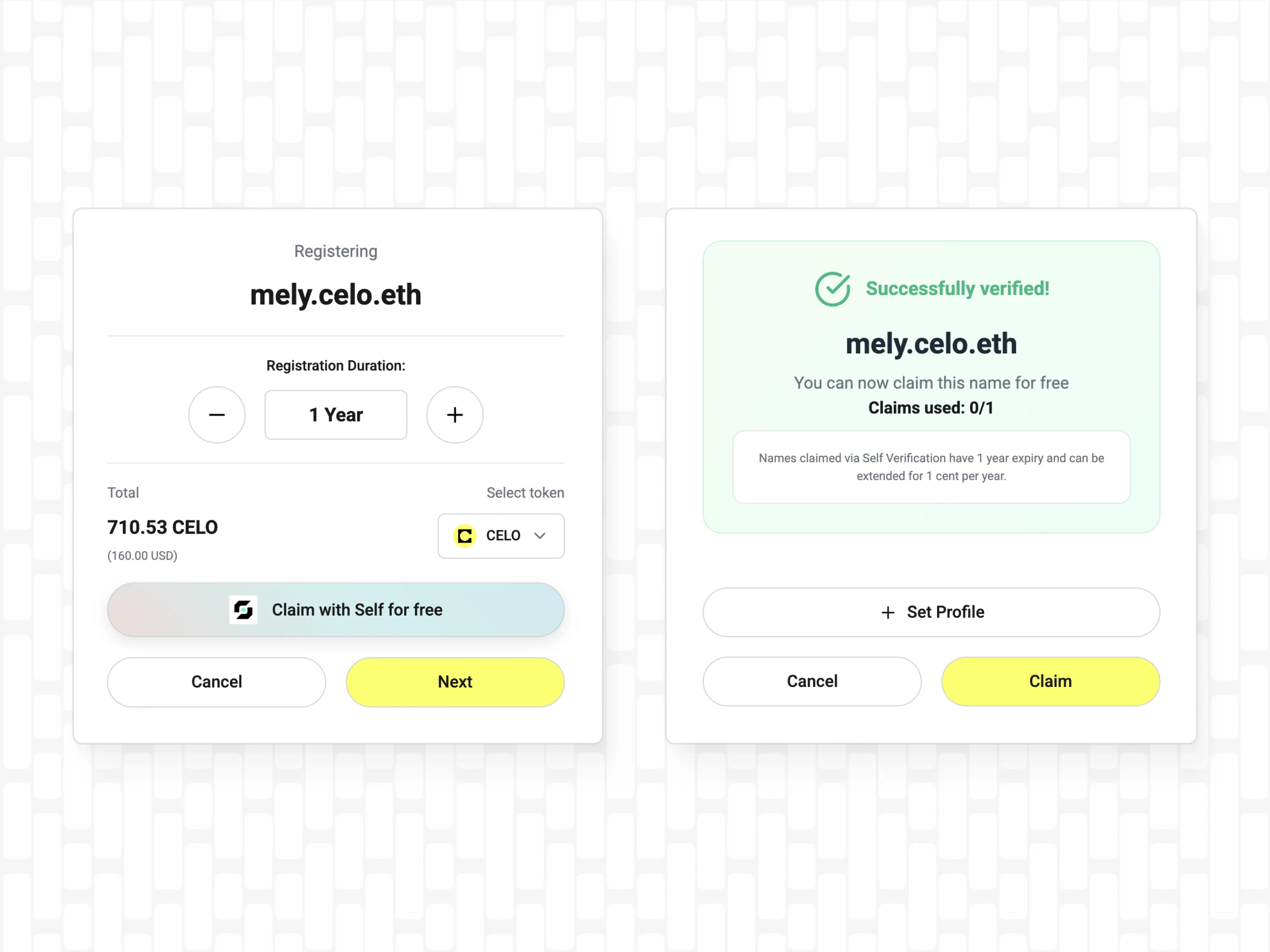 To help real communities grow within the ecosystem and protect users against bots, an integration with Self provides an optional verification path for name owners. Users with a Self verification are able to register their Celoname at near-zero-cost (0.01$/year). Self verifications use zk-tech where the user's data is encrypted on their own device. This means that neither Celo nor ENS have access to sensitive user data. All Celonames work the same with or without a verification.